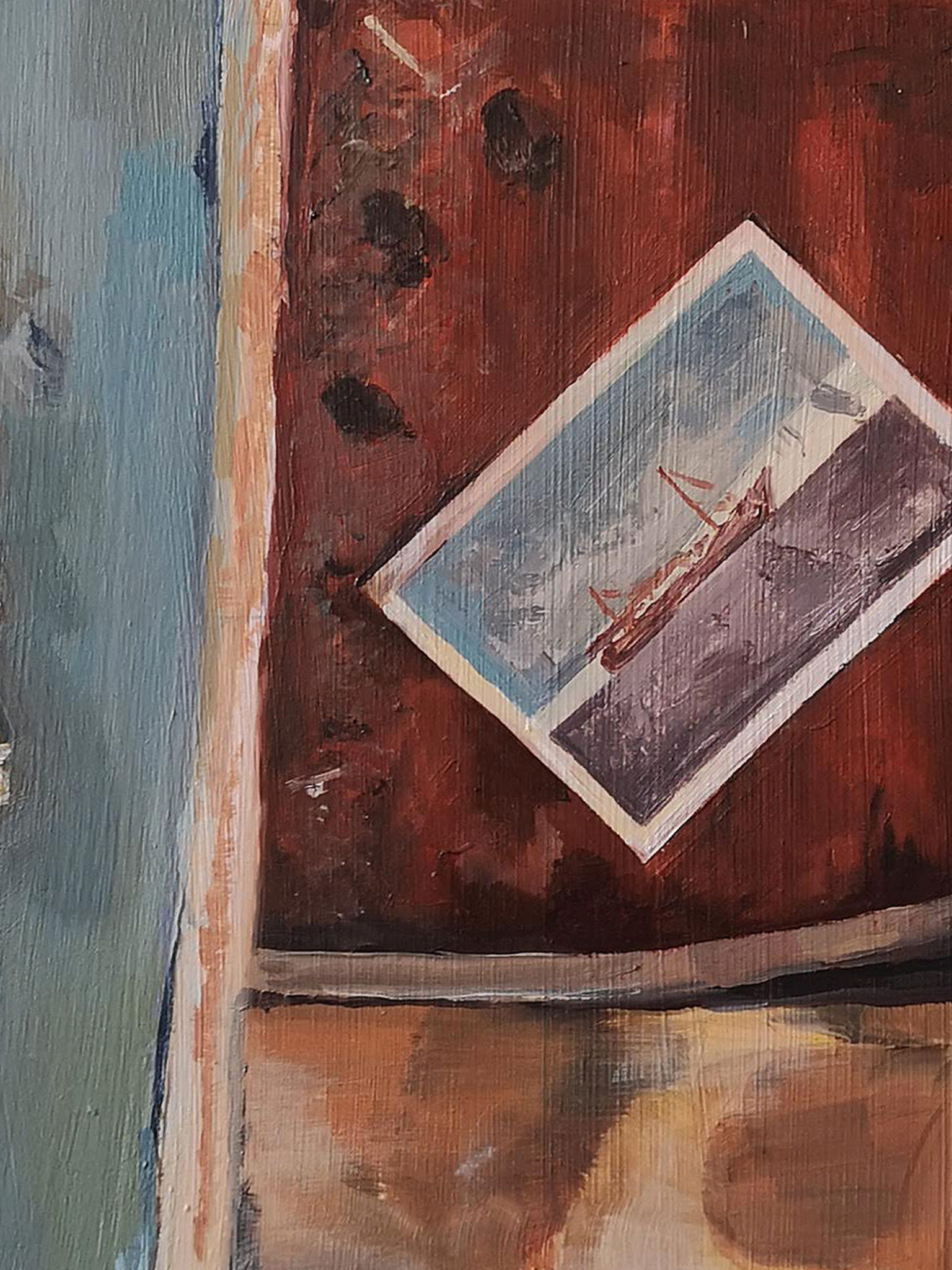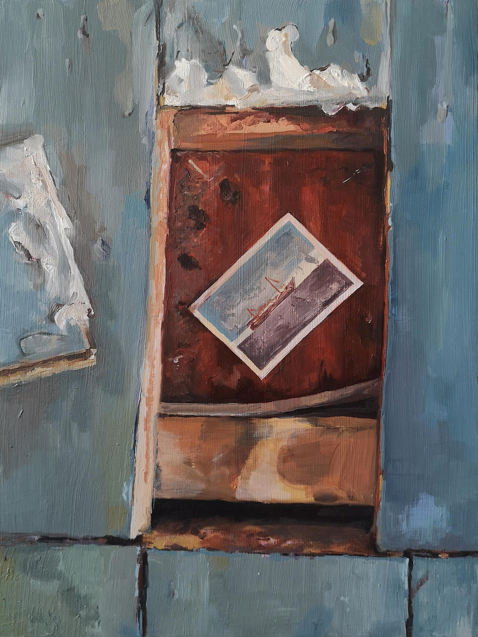 Myself and my flatmate found this photograph under a floorboard while mouse proofing our flat during lockdown. The holiday scene felt ironic given the circumstances, so I decided to paint it.