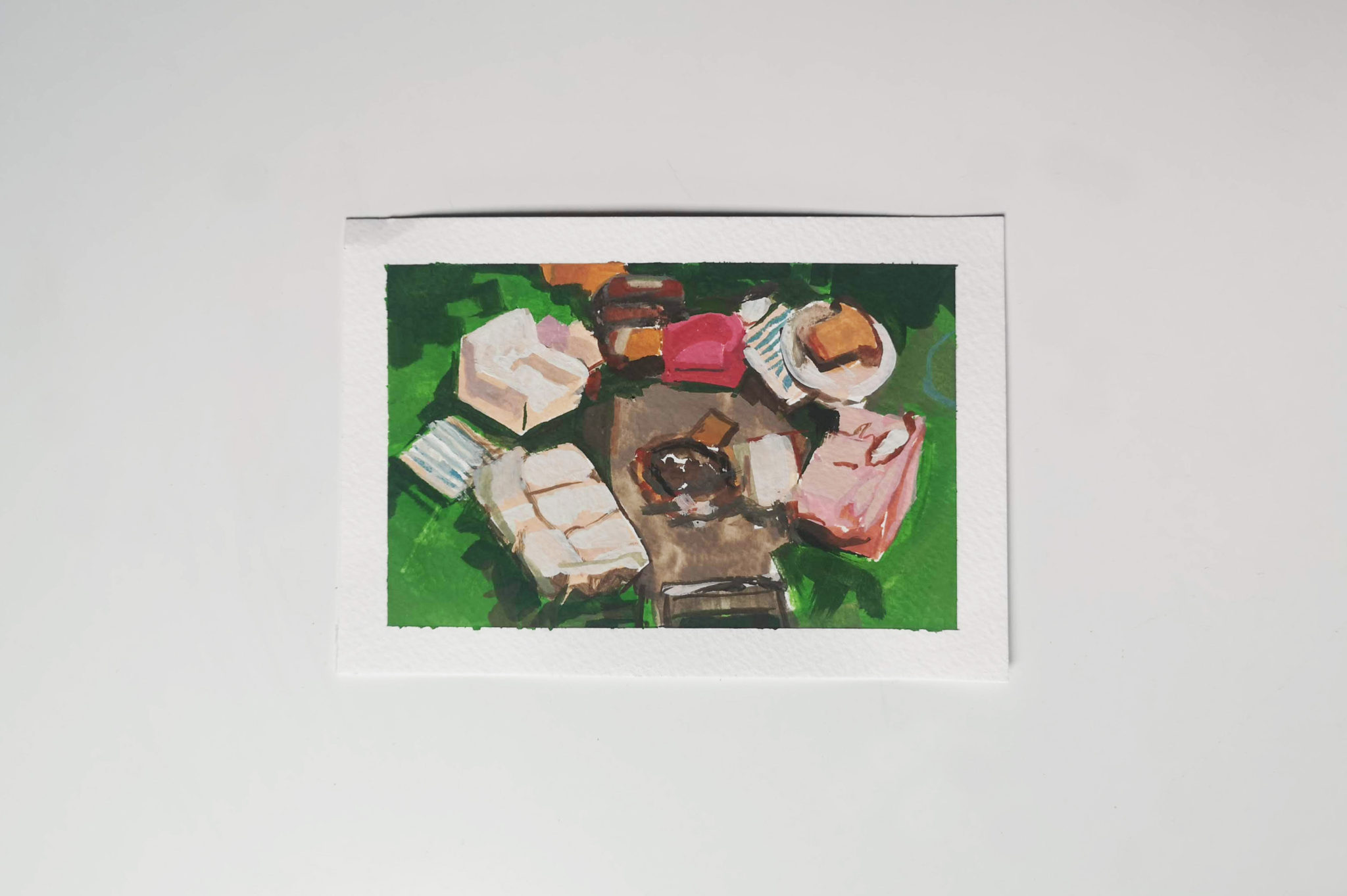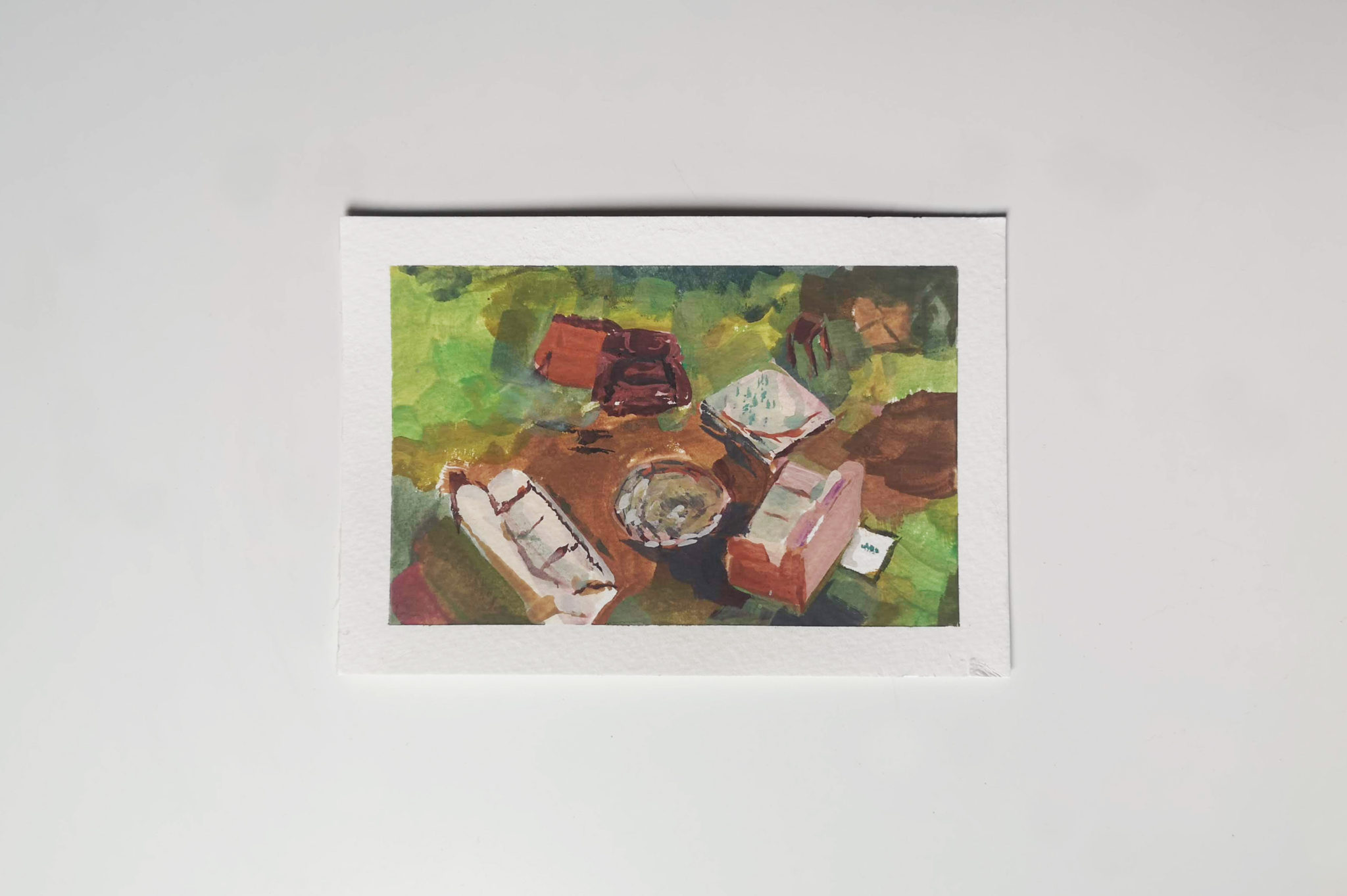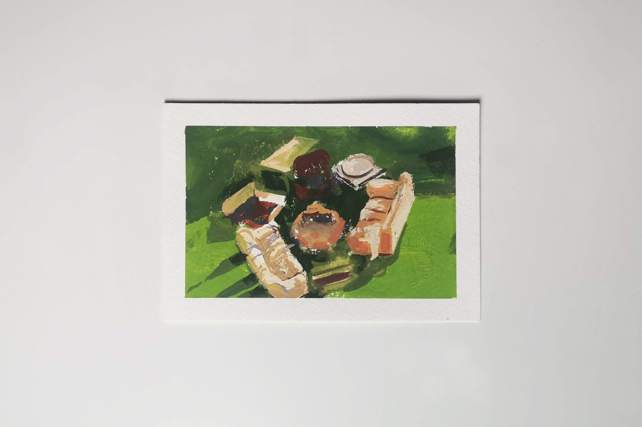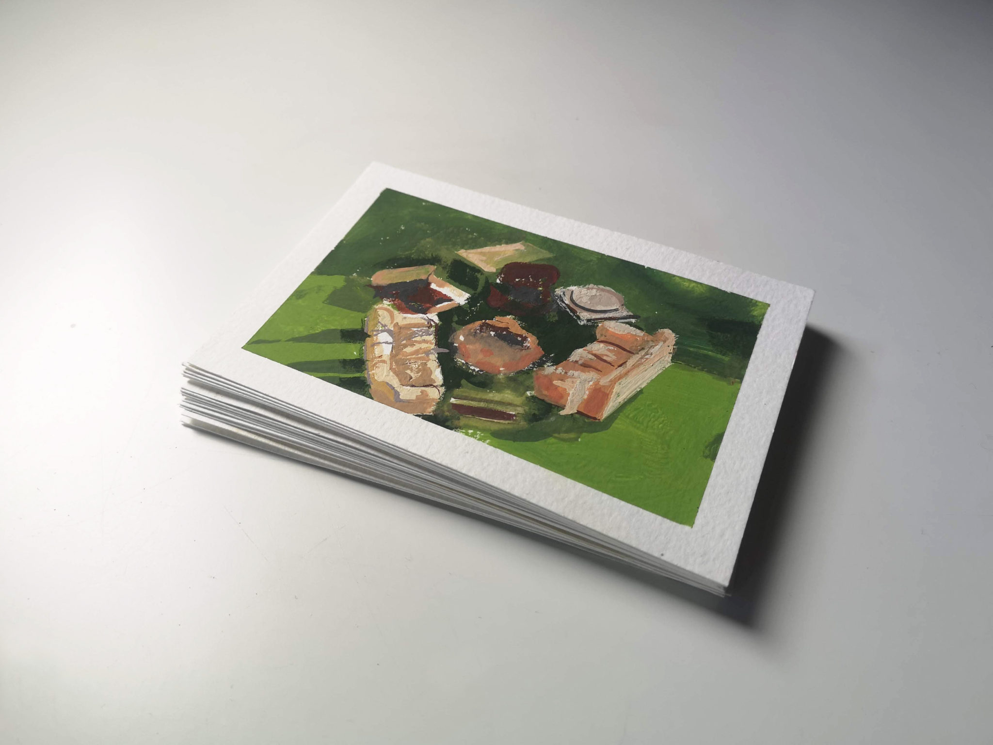 I created 14 postcards in this series created during lockdown. Painted with the intention of posting out to my friends and family, providing them with a single fragment of my every day.