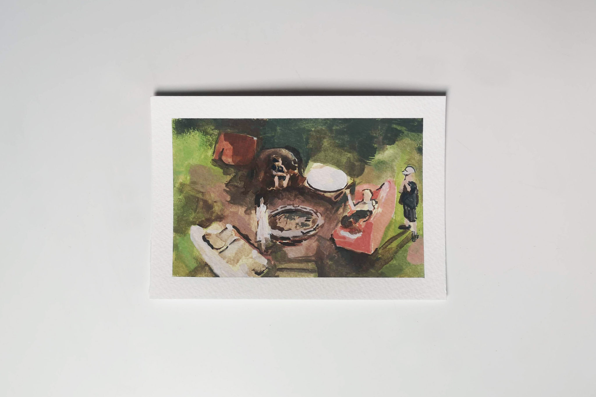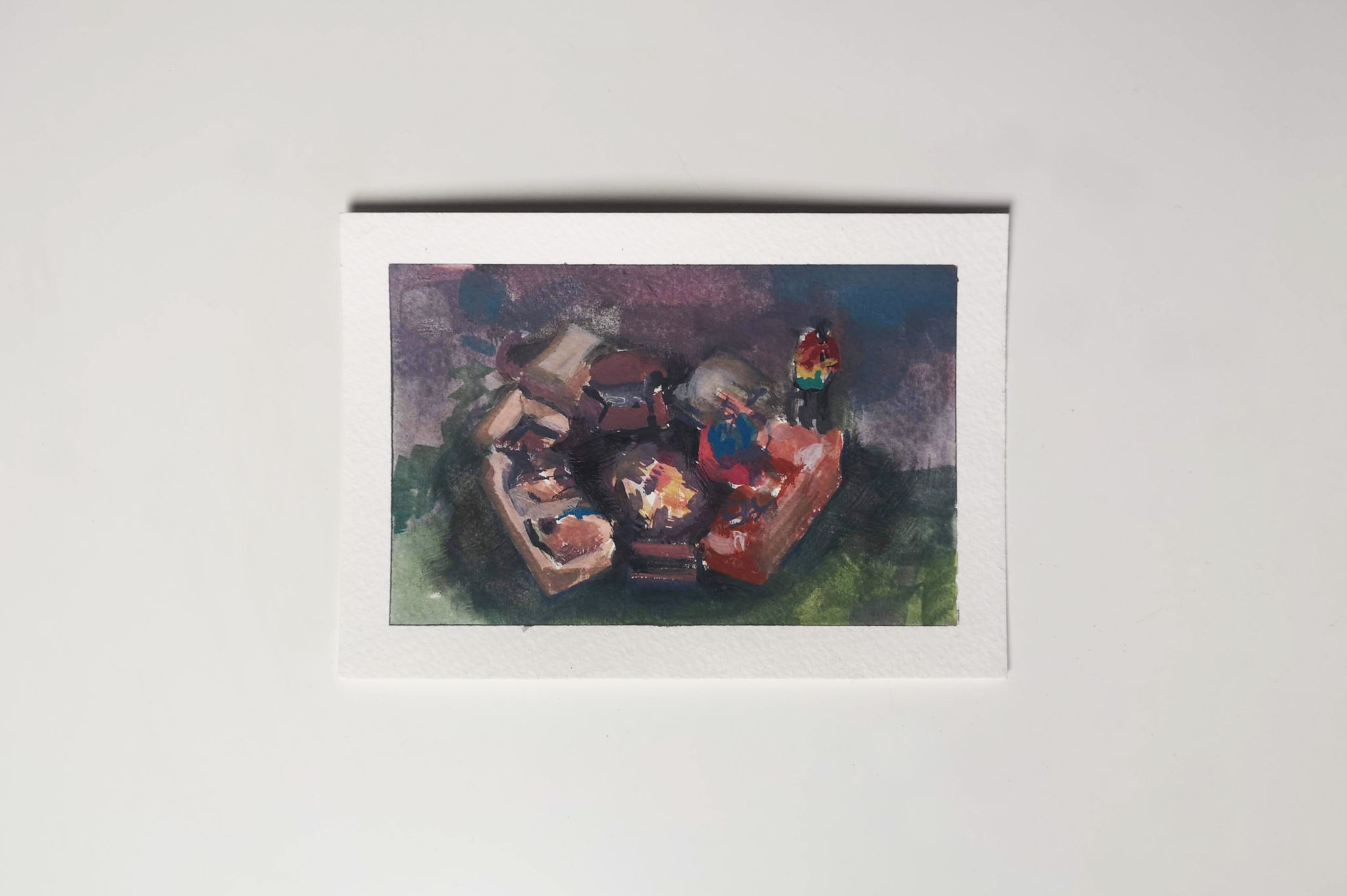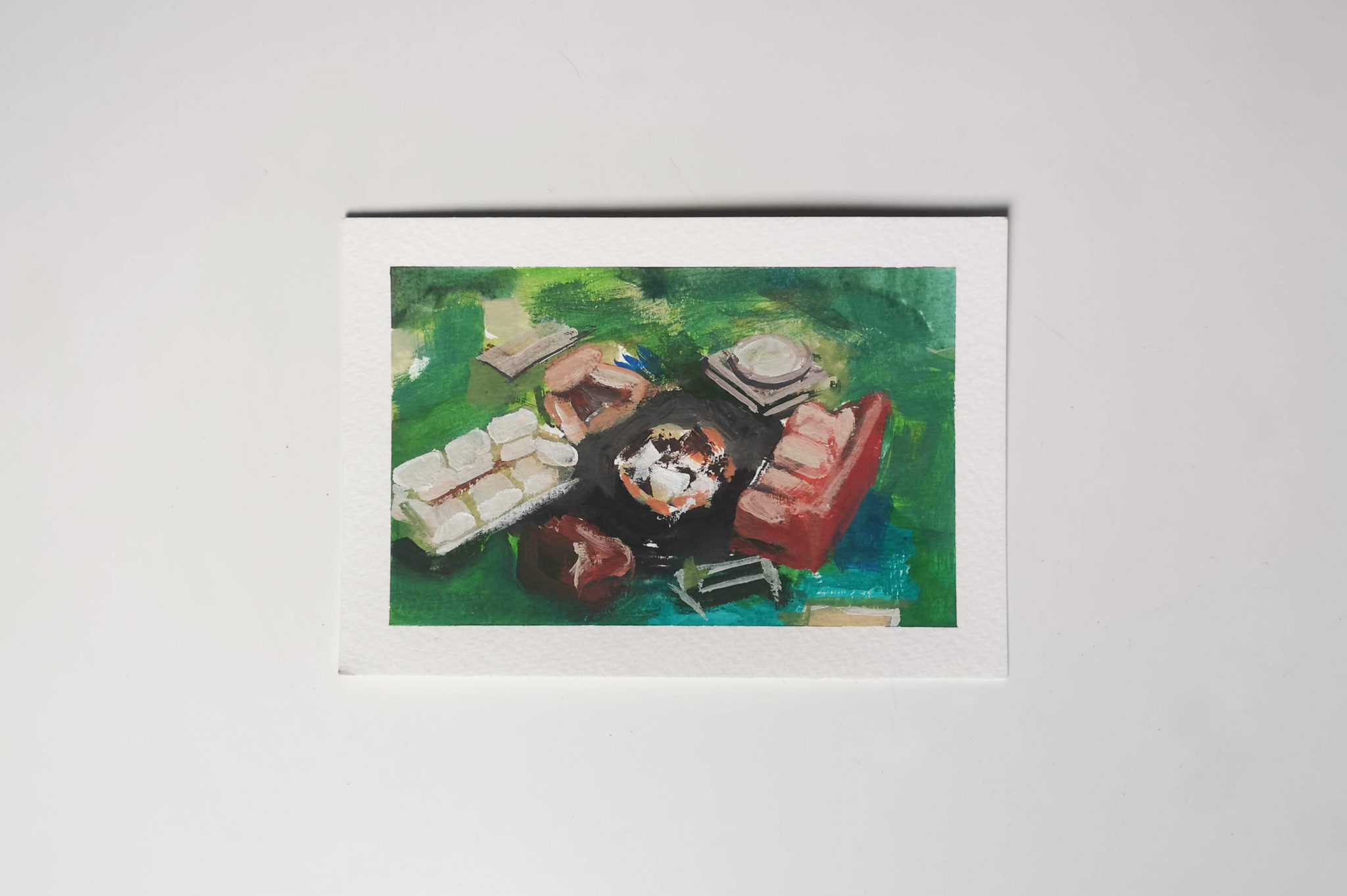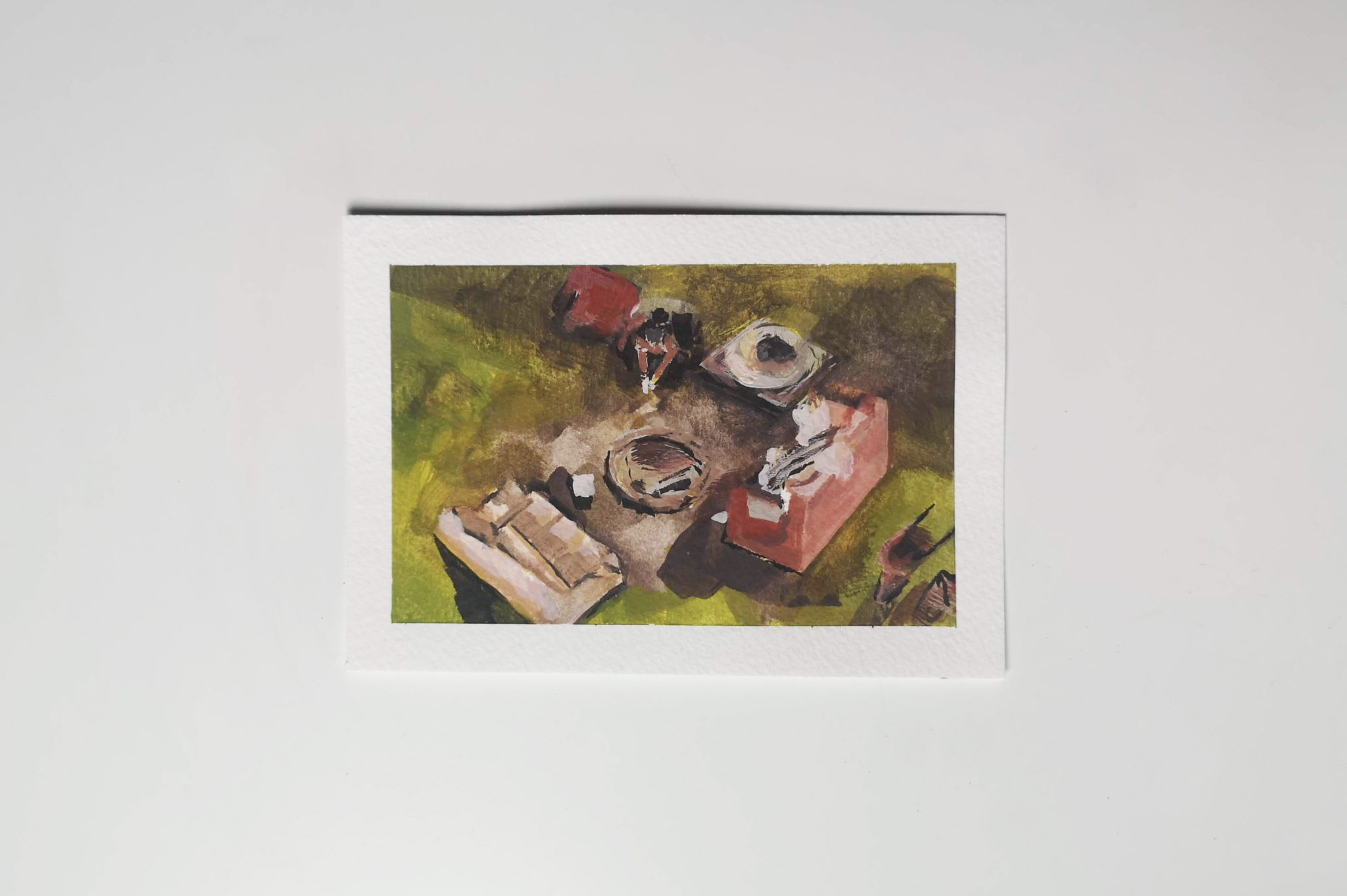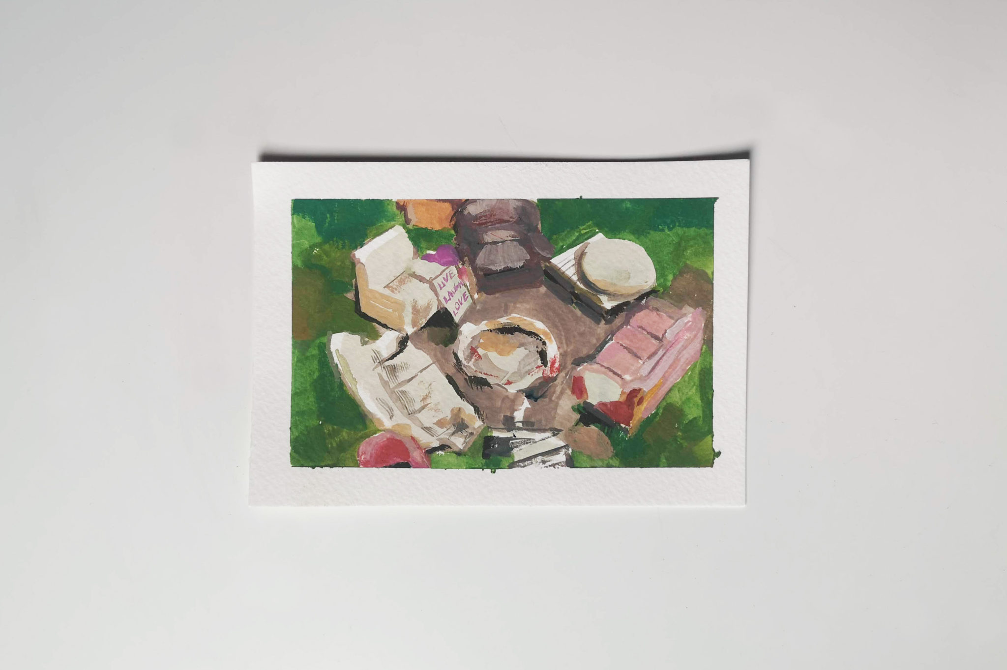 I created 14 postcards in this series created during lockdown. Painted with the intention of posting out to my friends and family, providing them with a single fragment of my every day.
